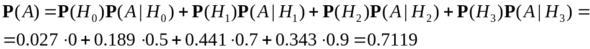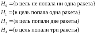 Задача 2. Производится стрельба по цели тремя снарядами. Каждый снаряд попадает в цель с вероятностью p=0.7 независимо от других. Цель поражается с вероятностью 0,5 при попадании одного снаряда, с вероятностью 0,7 – при попадании двух и с вероятностью 0,9 – при попадании трех снарядов. Найти полную вероятность поражения цели.