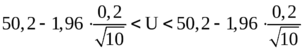 Задача 5. При помощи вольтметра, точность которого характеризуется средним квадратичным отклонением 0,2 В, произведено 10 измерений напряжения бортовой батареи. Среднее арифметическое результатов измерения, имеющих нормальный закон распределения, составляет 50,2 В. Найти интервал, который с вероятностью 0,95 “накроет” истинное значение напряжения батареи.