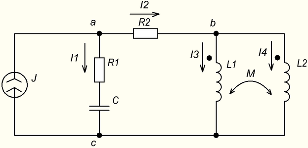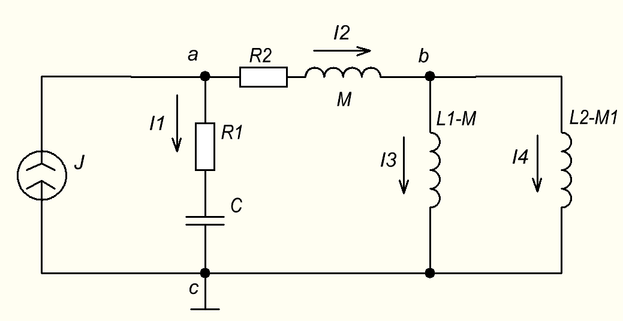 Учитывая, что магнитносвязанные катушки имеют общий узел и подсоединены к нему одноимёнными защимами, составим эквивалентную схему без магнитных связей: