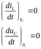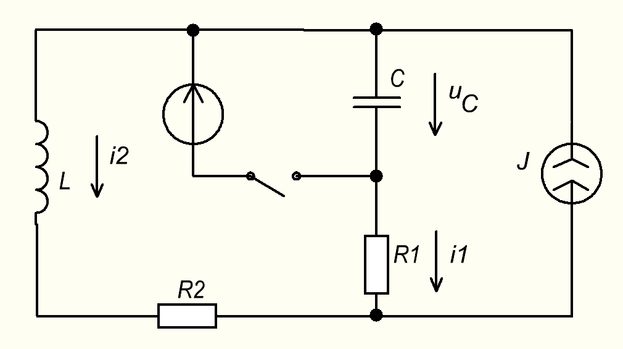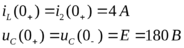 После коммутации ключ разомкнут. Согласно законам коммутации ток через индуктивность и напряжение на конденсаторе не могут измениться скачком, поэтому сразу после коммутации они равняются их значениям до неё: