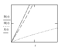 Построить графически распределения модулей векторов индукции магнитного поля B и напряжённости магнитного поля H, а также модуля вектора намагниченности J в зависимости от r в интервале от R до R0. Определить поверхностную плотность токов намагничивания i'п на внутренней и внешней поверхностях трубки и распределение объёмной плотности токов намагничивания i'об(r).