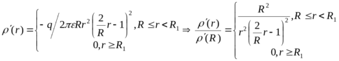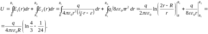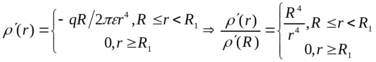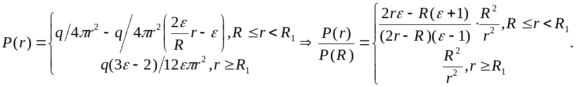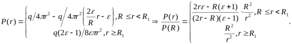 Сферический конденсатор имеет радиусы внешней и внутренней обкладок R1 и R0 соответственно. Заряд конденсатора равен q. Величина диэлектрической проницаемости между обкладками меняется по линейному закону от значения ε1 до ε2 в интервале радиусов от R до R1 и ε3=const в интервале радиусов от R1 до R0 (R1=½(R0+R)). Построить графически распределение модулей векторов электрического поля E, поляризованности Р и электрического смещения D между обкладками конденсатора. Определить поверхностную плотность зарядов на внутренней и внешней поверхностях диэлектриков, распределение объёмной плотности связанных зарядов ρ’(r), максимальную напряжённость электрического поля Е и ёмкость конденсатора.