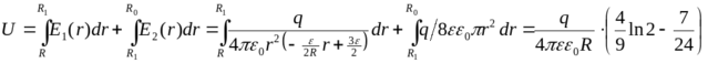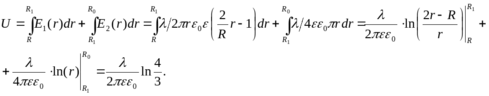 Цилиндрический бесконечно длинный диэлектрический конденсатор заряжен до разности потенциалов U и имеет радиусы внешней и внутренней обкладок R0 и R соответственно. Величина диэлектрической проницаемости между обкладками меняется по линейному закону от значения ε1 до ε2 в интервале радиусов от R до R1, и ε3=сonst в интервале радиусов R1 до R0. Построить графически распределение модулей векторов электрического поля E, поляризованности Р и электрического смещения D между обкладками конденсатора. Определить поверхностную плотность зарядов на внутренней и внешней поверхностях диэлектриков, распределение объёмной плотности связанных зарядов ρ’(r), максимальную напряжённость электрического поля Е и ёмкость конденсатора на единицу длины.