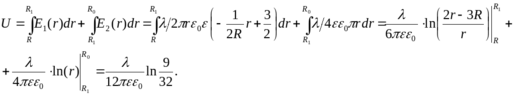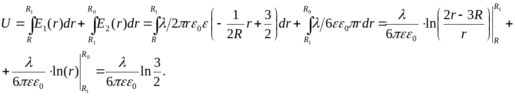 Цилиндрический бесконечно длинный конденсатор заряжен до разности потенциалов U и имеет радиусы внешней и внутренней обкладок R0 и R соответственно. Величина диэлектрической проницаемости между обкладками меняется по закону ε(r)=f(r). Построить графически распределение модулей векторов электрического поля E, поляризованности Р и электрического смещения D между обкладками конденсатора. Определить поверхностную плотность зарядов на внутренней и внешней поверхностях диэлектриков, распределение объёмной плотности связанных зарядов ρ’(r), максимальную напряжённость электрического поля Е и ёмкость конденсатора.