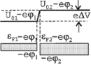 На левом рисунке - энергетические диаграммы металлов 1 и 2 до приведения их в контакт. Справа - энергетические диаграммы металлов 1 и 2, находящихся в контакте, когда между ними появляется контактная разность потенциалов