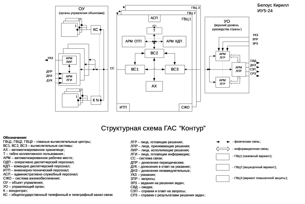 Государственная автоматизированная система "Контур" была предназначена для управления народным хозяйством СССР в мирное время и в особый период. Соответственно этому она состояла из УО-Руководства страны (верхнее звено), ОУ-предприятий и организаций, важных для экономики и обороноспособности и естественно-рассредоточенных на территории страны, (верхние звенья) и трёх ГВЦ с идентичными функциями, но удалёнными друг от друга для большей живучести системы (центральные звенья). Верхнее и нижние звенья взаимодействовали с ГВЦ посредством СС на основе государственных телеграфных и телефонных каналов связи.