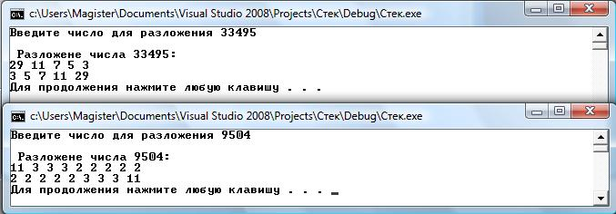 3. В функции main( ) распечатать множители, которые функция Multipliers( ) записывает в стек, сначала по убыванию, а потом по возрастанию.