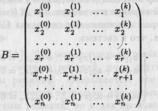 где i = (0, r). Вычтем из первой строки матрицы В линейную комбинацию последних к=n-r строк с коэффициентами a(1,r+1).....a(1n). Тогда, согласно первому равенству из (9.12),получим нулевую строку. Аналогично преобразуем строки 2-ю, r-ю, используя оставшиеся равенства (9.12). В результате этих преобразований мы получим матрицу, у которой первые г строк нулевые. Так как при этом ранг матрицы не меняется, то RgВ<=п-r=к.