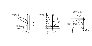 Другие возможные случаи расположения параболы на плоскости и соответствующие канонические уравнения приведены на рисунке справа.