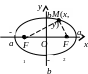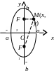 Эллипс может быть расположен так, что большая полуось расположена на оси Оу. В этом случае фокусами являются точки F1(0, -c) и F2(0, c), точка M(x, y) удовлетворяет уравнению | F1M | + | F2M | = 2b, малая полуось