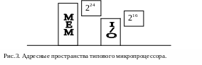 1) сигналы "WR" и "RD", обеспечивающие общение микропроцессора с памятью ("WR" – "write", - реализация процедуры записи данных, "RD" – "read" - процедуры считывания данных). Микропроцессоры могут иметь несколько адресных пространств (микропроцессоры INTEL, например, имеют два адресных пространства (рис.3): пространство "ВВОДА – ВЫВОДА" (I/O – Input/Output) и пространство "ПАМЯТИ" (MEM - Memory)). В адресном пространстве "ВВОДА – ВЫВОДА" размещают периферийные (внешние) устройства.