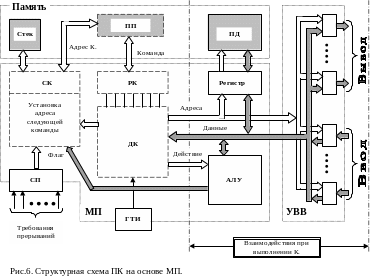 Устройства на схеме (рис.6), обведенные пунктиром являются управляющими и, в основном, запускаются от тактовых импульсов. Сплошная линия – управляемые устройства: побуждаются к выполнению действий сигналами управляющих устройств.