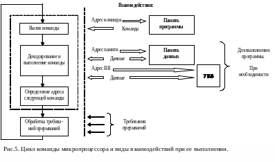 При выполнении команды программы микропроцессор считывает ее код, потом операнды, затем начинает ее выполнение, которое обычно совмещено со считыванием кода следующей команды. Это так называемый конвейерный механизм, применяемый во всех современных микропроцессорах.