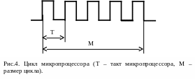 Микропроцессор является частотным устройством и имеет свою тактовую (генерируемую им самим) частоту. Каждая команда выполняется за то или иное число машинных циклов. Один период тактовой частоты называется тактом микропроцессора. В течение какого-то определенного количества тактов (цикла) выполняется одно элементарное действие микропроцессора (рис.4), например, пересылка данных. Команда может быть выполнена за несколько циклов. Следовательно, быстродействие микропроцессора зависит как от тактовой частоты, так и от того, насколько экономно микропроцессор использует свои такты в цикле. Т.е., чем меньше тактов необходимо для выполнения команды, тем быстрее р