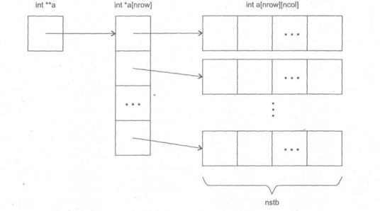 В операторе 1 объявляется переменная типа «указатель на указатель на int » и выделяется память под массив указателей на строки массива (количество строк — nrow). В операторе 2 организуется цикл для выделения памяти под каждую строку массива. В операторе 3 каждому элементу массива указателей на строки присваивается адрес начала участка памяти, выделенного под строку двумерного массива. Каждая строка состоит из ncol элементов типа int (рис. 1).