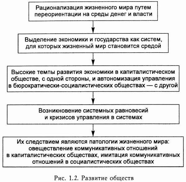 Основной проблемой и спецификой современности, по Хабермасу, является разъединение системы и жизненного мира, что выражается в процессе овеществления современных жизненных миров и все большей их провинциализации. Жизненный мир становится достоянием частной жизни и выпадает из социальной системы, которая включает в себя деньги и власть, не зависящие от языка и коммуникации среды. Это означает не что иное, как поглощение жизненных миров системами. Хабермас считает, что современное развитие общества характеризуется протеканием процессов, показанных на рис. 1.2.