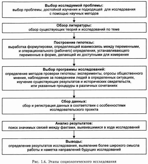 Социологическое исследование это способ получения знаний о социальном мире, основанный на строгом сборе фактов и их логическом объяснении. Оно состоит в систематизированном ряде г шагов, направленных на обеспечение максимальной объективности в изучении проблемы. В идеальном варианте социологическое исследование следует подобной поэтапной процедуре, хотя на практике это не всегда представляется возможным. Даже при таких обстоятельствах описанные ниже этапы обеспечивают полезные вехи проведения научного исследования (рис. 1.6).