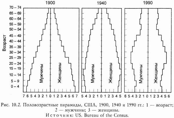 Половозрастная пирамида на 1900 г., представленная на рис. 10.2, типична для населения, которое увеличивается за счет роста рождаемости и снижения смертности. Пирамиды на 1940 и 1990 гг. дают совершенно иную картину. Они показывают снижение как уровня рождаемости, так и смертности. Основания обеих пирамид сужены, что отражает снижение уровня рождаемости в 1930 г. и в период с 1970 по 1985 г. Короткие планки в возрастной группе от 50 до 60 лет на пирамиде 1990 г. указывают, что индивиды, занимающие нижние планки на пирамиде 1940 г., переместились в возрастные группы старше среднего возраста.