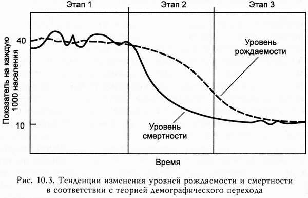 Ряд социологов использовали идею демографического перехода для отражения характеристик роста населения в современную эпоху. С исторической точки зрения эта концепция пытается объяснить то, что происходило в европейских странах в прошедшие 200 лет, и используется для прогнозирования того, что произойдет в развивающихся странах в будущем. Теория демографического перехода утверждает, что процесс модернизации связан с тремя этапами в движении населения (рис. 10.3).