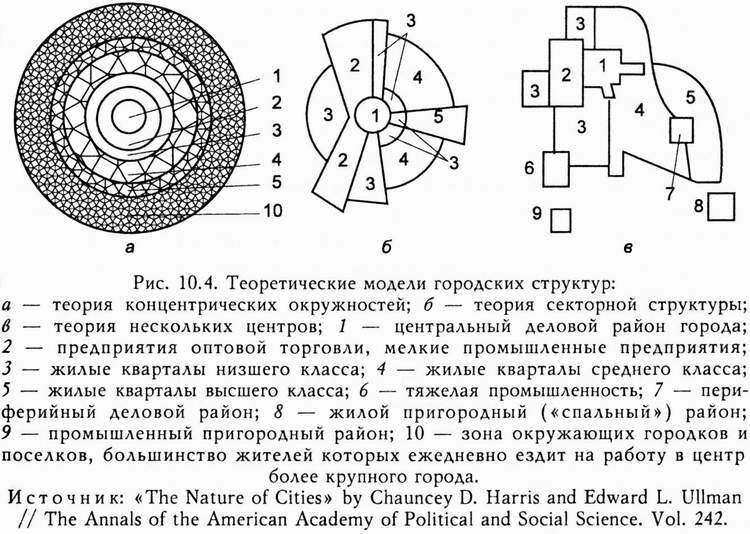 Социологи, стремясь понять, каким образом люди территориально оформляют свои взаимосвязи и осуществляют деятельность, разработали несколько моделей, с помощью которых пытаются выявить экологические схемы и структуры роста городов (см. рис. 10.4).