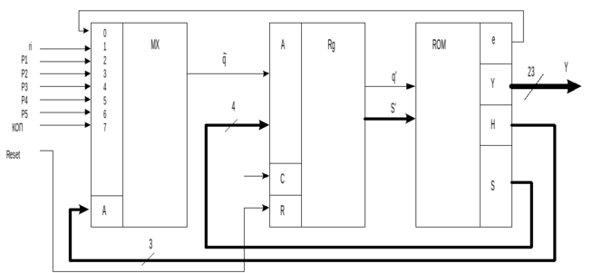 Функциональная схема управляющего автомата построена на основе описания алгоритма в закодированной форме и реализует собой управляющий автомат на ПЗУ с частичной записью адреса.