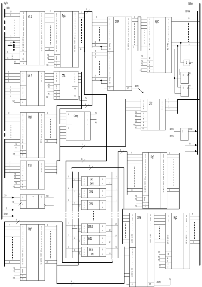 Единственный шестнадцатиразрядный сумматор работает по такому же алгоритму, только внешние входы его обозначаются cr и CR вместо p и P соответственно. Причјм, вход cr сумматора не активен, а наличие сигнала на выходе CR приводит к аварийной остановке, и свидетельствует о переполнении разрядного пространства внутри сумматора.