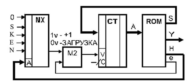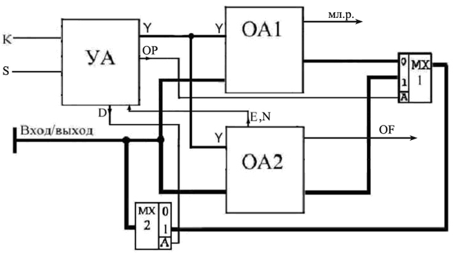 Мультиплексор 1 выбирает с какого операционного автомата выдавать данные на шину входа/выхода в зависимости от сигнала ОР – номер исполняемой операции.