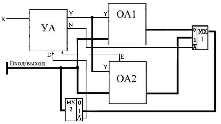Входная шина используется также и как выходная. По ней будут поступать входные данный на входы операционных автоматов, и на неё же будут поступать выходные данные с выходов операционных автоматов.