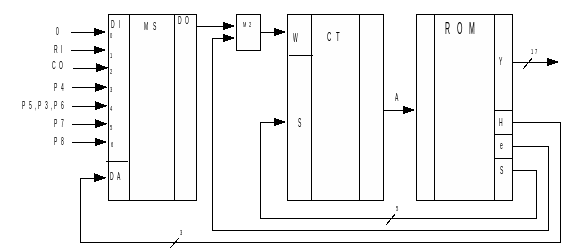 На вход УА подаются сигналы Рi от операционного автомата соответствующие логическим блокам алгоритма. С выхода управляющего автомата снимаются микроинструкции хранящиеся в ПЗУ (ROM) УА. Микроинструкции обеспечивают наличие необходимых управляющих сигналов на элементах операционного автомата в соответствии с выбраным блоком алгоритма. Также в ПЗУ содержится адресная часть позволяющая в следующем такте работы выбрать новый адрес управляющей памяти.