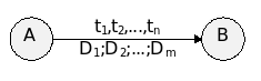 Смысл ti прежний - если в состоянии A очередной анализируемый символ совпадает с ti для какого-либо i = 1, 2 ,... n, то осуществляется переход в состояние B; при этом необходимо выполнить действия D1, D2, ... ,Dm.