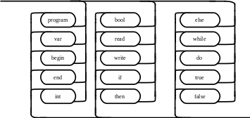 1) program; 2) var; 3) int; 4) bool; 5) begin; 6) end; 7) if; 8) then; 9) else; 10) while; 11) do; 12) read; 13) write; 14) true; 15) false.