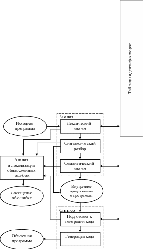 Процесс компиляции состоит из двух основных этапов: синтеза и анализа. На этапе анализа выполняется распознавание текста исходной программы и заполнение таблиц идентификаторов. Результатом этапа служит некоторое внутреннее представление программы, понятное компилятору.