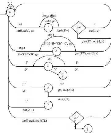 4) CS - текущее состояние буфера накопления лексем с возможными значениями: Н - начало, I - идентификатор, N - число, С - комментарий, DV – двоеточие, О - ограничитель, V - выход, ER –ошибка;