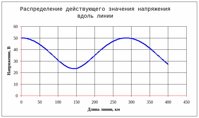 1. График распределения действующего значения напряжения вдоль линии в функции координаты для линии без потерь.