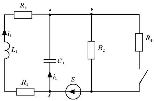 Дана электрическая цепь, в которой происходит коммутация. В цепи действует постоянная ЭДС E. Рассмотреть переходный процесс в цепи второго порядка. Определить закон изменения во времени указанной величины.