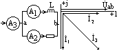 | Дано: e=141sinωt В R1=3 Ом, R2=2 Ом L=0,00955 Гн ω=314c-1 Определить ток и напряжение на элементах цепи. Решение: запищем уравнение для мгновенных значений: i(R1+R2)+L(di/dt)=e, В комплексах: I(.)(R1+R2)+jωLI(.)=E(.) или I(.)Z=E(.), где Z=R1+R2+jωL=5+3j=5,82ej31º. Комплекс ЭДС: E(.)=141/√2 =100В. Ток: I(.)=E(.)/Z=100/5,8ej31º= =17,2e-j31ºA. Теперь найдем напряжения: UR1(.)=Uab(.)=I(.)R1=51,6e-j31º UL(.)=Ucd(.)=jωLI(.)= =3j*17,2e-j31º=51,6ej59ºВ Векторная диаграмма изображена на рисунке, вектор Е(.) направлен по оси +1. Ток отстает от него на 31º Дано: R=4 Ом, ω=105c-1 Определить величину емкости С, ечли при ЭДС E=10мВ, ток в цепи I=2мА Решение: Комплексное сопротивление цепи: __________ Z=R – j/ωC; его модуль z=√R2+(1/ωC)2 По закону Ома: I=E/z. Отсюда z=E/I=5 Ом. Xc=1/ωC=√z2-R2` =3 Ом, C=1/ωXc=3,33мкФ. На схеме параллельно включены индуктивное сопротивление XL=ωL и активное R, численно равное XL. Показание А2 равно 5А. Определить показания А3. Сопротивления амперметров не учитывать. Решение: Построим векторную диаграмму. Напряжение Uab(.) совпадает по фазе с током I2(.). Ток I1(.) отстает от I2(.) на 90º и равен ему по величине. I3(.)=I1(.)+I2(.). Модуль тока I3(.) равен 5√2=7,05A. Амперметр показывает 7,05A. Дано: показания приборов: U=120В I=5A, P=400Вт. За- мыкание ключа К приводит к уменьшению показаний амперметра. Найти Zвх Решение: Модуль z=U/I=24Ом, cosφ=P/UI=0,666 sinφ=0,745; Rвх=zcosφ=16Ом, Xвх=zsinφ=18 Ом Zвх=(16+j18)Ом. Если показания амперметра при замыкании ключа станут больше, значит φ отрицательно, если меньше, то положительно. НЕСИНУСОИДАЛЬНЫЙ ПЕРИОДИЧ. ТОК Дано: Найти 1 и 3 гармоники f(x). Значения ординат fp(x) за 1ый полупериод при разбивке периода на n=24 части следующие: p 1 2 3 4 5 6 7 8 9 fp(x) 7 11 13,5 15,4 17,4 20,5 25,4 32,5 27,7 (10; 19,2), (11; 10), (12; 5) Решение: Т.к. кривая симметрична относительно оси абсцисс, то A0=A2'=A2''=A4'…=0. A1'=(2/n)*Σ[p=1,n]fp(x)sinpx=(4/n)* *Σ[p=1, n/2]fp(x)sinpx = =(4/24)*(7sin7º30'+11sin22º30'+..+5sin172º30')=25,3 A1''=(4/n)*Σ[p=1,n/2]fp(x)cospx≈ -5,23 A3'=(4/24)*Σ[p=1;12]fp(x)sinp3x≈3,47 A3''=(1/6)*Σ[p=1;12]fp(x)cosp3x≈5,1 Амплитуда 1-ой гармоники A1=√A1'2+A1'2`=25,9 Тангенс угла ψ1, на который начало 1-ой гармоники смещено по отношению к началу кривой f(x): tgψ1=A1''/A1'= -0,206, ψ1= -11º40' A3=√A3'2+A3'2`=6, tgψ3=1,47, ψ3=55º50'. Следовательно, если ограничится 1 и 3 гармоникой, то f(ωt)=25,9sin(ωt-11º40')+6sin(3ωt+55º50') | Дано: ik(t)=Ikmcos2ωt, e(t)=E0+Emsinωt. Индуктивность L4 магнитно связана с L3. Определить мгновенно значение тока i3 и напряжения uab. Ikm=5A, ω=1000рад/с, E0=3В, Em=6B, R1=3 Ом, L3=3мГ, M=1мГ. Решение: По 1-му закону Кирхгофа: uab – L4(di4/dt)+ M(di3/dt)=0, но i4=0, uab= -M(di3/dt). Воспользуемся принципом наложения и найдем составляющие i3 от каждого источника в отдельности. Схема б) для расчета токов от постоянной составляющей ЭДС. Левая ветвь разомкнута, т.к. в нее включен источник тока с бесконечным сопротивлением. Правая ветвь короткозамкнута, т.к. индуктивность для постоянного тока имеет нулевое сопротивление. При этом i3(0)=E0/R1=1A. Первую гармонику i3(1) находим используя рисунок в), I(.)3m(1)= =6/(3+3j)=1,41e-j45º. Вторую гармонику по г). I3m(2)=I(.)km*R1/(R1+j2ωL)=5ej90º*3/(3+j6)=2,23ej26º40' Мгновенное значение тока равно сумме найденных мгновенных значений: i3=1+1,41sin(ωt-45º)+2,23sin(2ωt+26º40')A uab= -M(di3/dt)= -1,41cos(ωt-45º)-4,46cos(2ωt+26º40') Дано: активное сопротивление катушки =0, при каких C1 и C2 входное сопротивление схемы для 1-ой гармоники =0, а для 9 равно бесконечности. Решение: для 1-ой гармоники: Z1=(-j/ωC1)+ (jωL2(-j/ωC2))/j(ωL2-(1/ωC2))=0 Z9=(-j/9ωC1)+ j9ωL2(-j/9ωC2)/j(9ωL2-(1/9ωC2))=∞ Совместное решение дает: 1/ωC2=81ωL2 и 1/ωС1=(81/80)*ωL2 Дано: на входе двухполюсника u=100+80sin(ωt+30º)+60sin(3ωt+20º)+ +50sin(5ωt+45º)В, i=33,3+17,87sin(ωt-18º)+5,59sin(5ωt+120º)A. Найти их действцющие значения. Решение: U=√1002+802/2 +602/2 +502/2`=127,1В I=√33,32 + 17,872/2 +5,592/2`=35,6A Дано: функция, не содержащая постоянной 