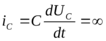 Если бы напряжение на емкости могло измениться скачком, т.е. измениться на конечную величину за бесконечно малый промежуток времени, то это соответствовало тому, что ток в емкости был бы равен: