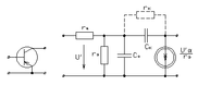б) Схема замещения высокочастотного транзистора с общим эмиттером.