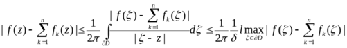 Теорема 2. Если ряд f(z)= fk(z) аналитических в области D со спрямляемой границей D и непрерывных в замыкании DD функций fk(z) равномерно сходится на границе D, то этот ряд равномерно сходится в D.(доказано только для любого компакта лежащего в D)