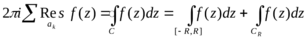 Доказательство. Для R>0 рассмотрим контур С=[-R,R] CR , СR – верхняя полуокружность, проходимая против часовой стрелки, [-R,R] – отрезок, проходимый слева направо. Считаем, что R выбрано достаточно большим так, что контур C содержит все полюса ak . Тогда