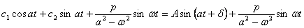 Если , то решение исходного уравнения ищем в виде . Подставляем его в уравнение: , , откуда , или , откуда . Тем самым, общее решение уравнения имеет вид . Здесь - амплитуда свободных колебаний, - частота свободных колебаний, - амплитуда вынужденных колебаний с частотой . Чем ближе величина , тем больше амплитуда вынужденных колебаний.