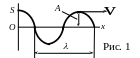 На рис.1 представлена гармоническая поперечная волна, распространяющаяся со скоростью v вдоль оси x, т.е. приведена зависимость между смещением S частиц среды и расстоянием х этих частиц от источника колебаний О для фиксированного момента времени t.