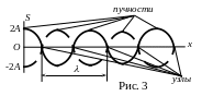 Исследуем сначала множитель coskx=cos2x/. В точках x=(1+2n)/4, где n=0,1,2..., coskx=0 и, следовательно, S=0. Эти точки не колеблются и поэтому называются узлами стоячей волны (см. рис.3). Расстояние между соседними узлами равно /2. Точки максимальной амплитуды стоячей волны называются пучностями. Их координаты x=n/2. Расстояние между соседними пучностями равно /2.