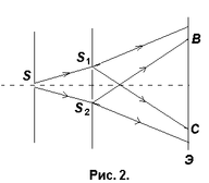 Она состоит из двух одинаковых сложенных основаниями призм. Свет от источника S преломляется в обеих призмах, в результате чего за призмой распространяются лучи, как бы исходящие от мнимых источников S1 и S2, являющихся когерентными. Таким образом, на экране Э (область ВС) наблюдается интерференционная картина.