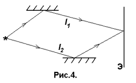 Пусть две когерентные волны (см. 3.1) создаются одним источником S, но до экрана проходят разные геометрические длины путей l1 и l2 в средах с абсолютными показателями преломления n1 и n2, соответственно (рис. 4). Тогда фазы этих волн [см. (1) и (2.9)] t - 1= t - k1l1 + 0, t - 2= t - k2l1 + 0, а разность фаз