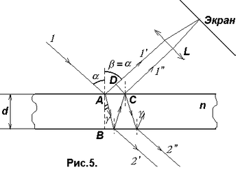 усть на плоскопараллельную прозрачную пленку (пластинку) с показателем преломления n и толщиной d под углом падает плоская монохроматическая волна (для простоты рассмотрим один луч). На поверхности пленки в точке А волна частично отражается (луч 1’) и частично преломляется (луч АВ). В точке В волна также частично отражается (луч ВС) и частично преломляется (луч 2’). То же самое происходит в точке С. Причем преломленная волна (луч 1”) накладывается на волну непосредственно отраженную от верхней поверхности (луч 1’). Эти две волны когерентны, если оптическая разность хода