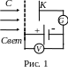 спускание электронов веществом под действием света называется внешним фотоэффектом. А.Г. Столетов (1988 г.) экспериментально исследовал фотоэффект. Схема опыта представлена на рис. 1. Плоский конденсатор, одной из пластин которого служила медная сетка С, а в качестве второй цинковая пластина К, был включен через гальванометр G в цепь аккумуляторной батареи. Напряжение между пластинами измерялось вольтметром. При освещении отрицательно заряженной пластины К светом, в цепи возникал электрический ток, называемый фототоком.
