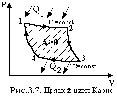 Цикл Карно состоит из 4 обратимых процессов: двух изотерм и двух адиабат (рис.3.7).