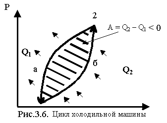 олодильной машиной называется тепловая машина, работающая по обратному циклу 1б2а1 (рис.3.6). При этом она получает от холодильника тепло Q2 и отдаёт нагревателю теплоту Q1. Газ в таком цикле совершает отрицательную работу, т. е. в таком цикле необходима работа внешних сил A = Q2- Q1.