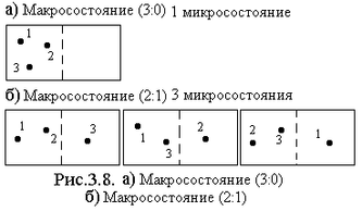 Макросостоянию (3:0) соответствует всего =1 возможное микросостояние (см. рис.3.8.а). Макросостоянию (2:1) соответствуют =3 возможных микросостояния (см. рис.3.8.б). - называют статистическим весом данного макросостояния системы. равно числу возможных микросостояний, соответствующих данному макросостоянию.